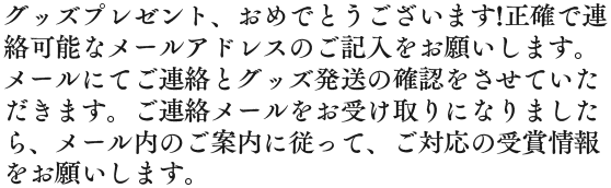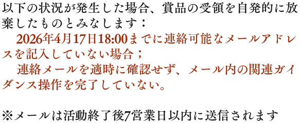 3.実物賞品に当選された方は、公式からのメールの案内に沿って賞品発送に必要な情報の登録を完了させてください。お届け先情報の未提出・誤記・記載不備など、ユーザー様のご都合により賞品が発送できない、または返送された場合、再発送はいたしかねますので、予めご了承ください。