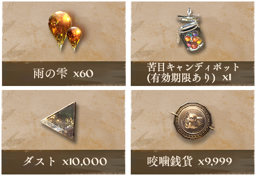 1.ゲーム内アイテム報酬は、5分以内にゲーム内メールより、登録したアカウントに配布されます。メールの有効期間は30日間となりますので、期限内にお受け取りください。また、苦目キャンディ、苦目キャンディポットは使用期限のあるアイテムとなりますので、受け取りの後はお早めにご使用ください。