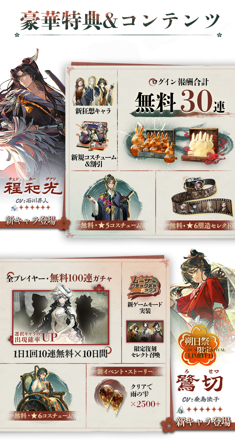 『リバース:1999』2.5周年特別バージョン『春不老』の予約イベントがただいま開催中です。イベントページにログインのうえ、予約ボタンを押して、雨の雫×60などのプレゼントを獲得できます。さらに、バージョン予約を行ったうえで、イベントページをシェアし、毎日イベントページにログインしてくださった方には、公式グッズが当たる抽選回数や、雨の雫、育成用素材などの豪華プレゼントもご用意しております!